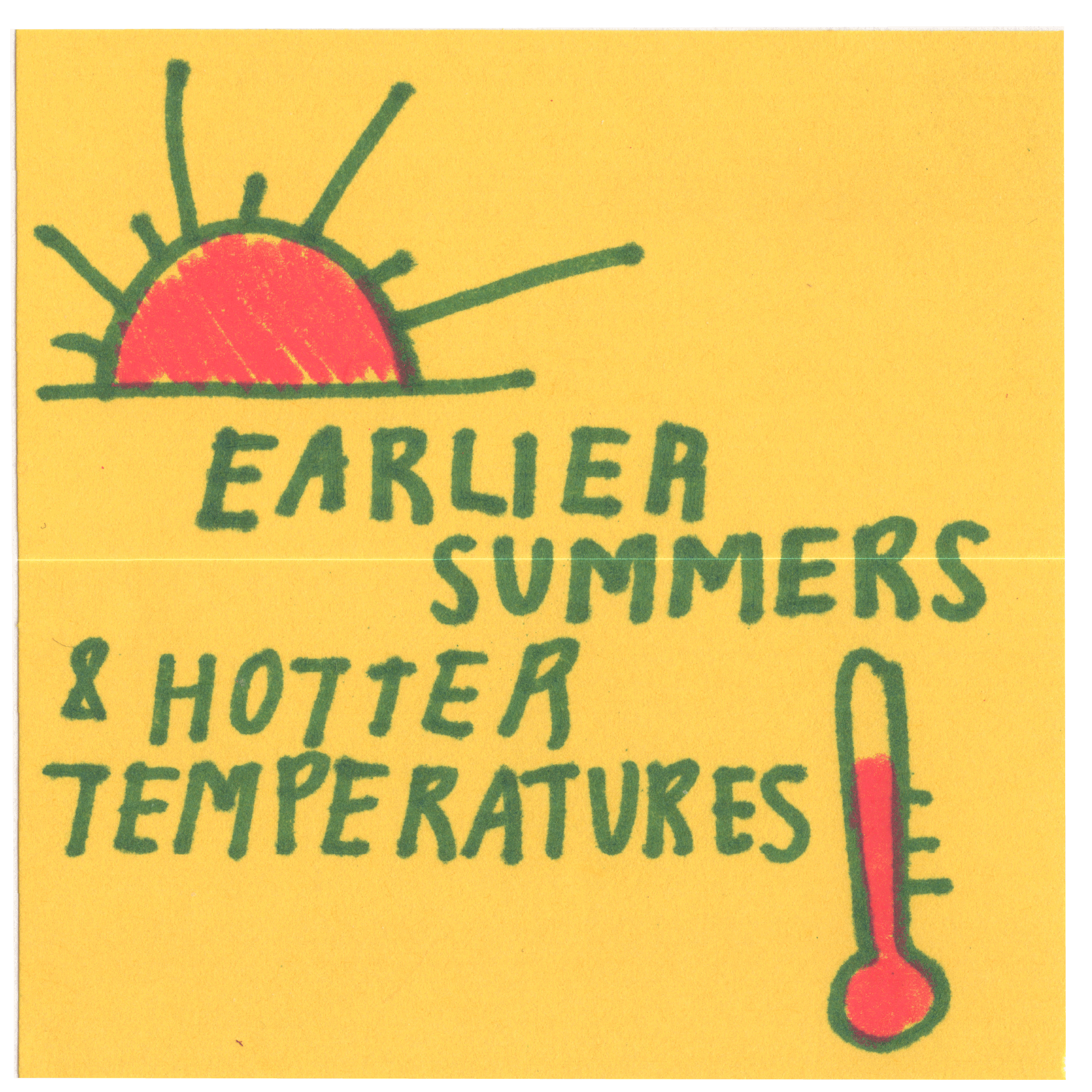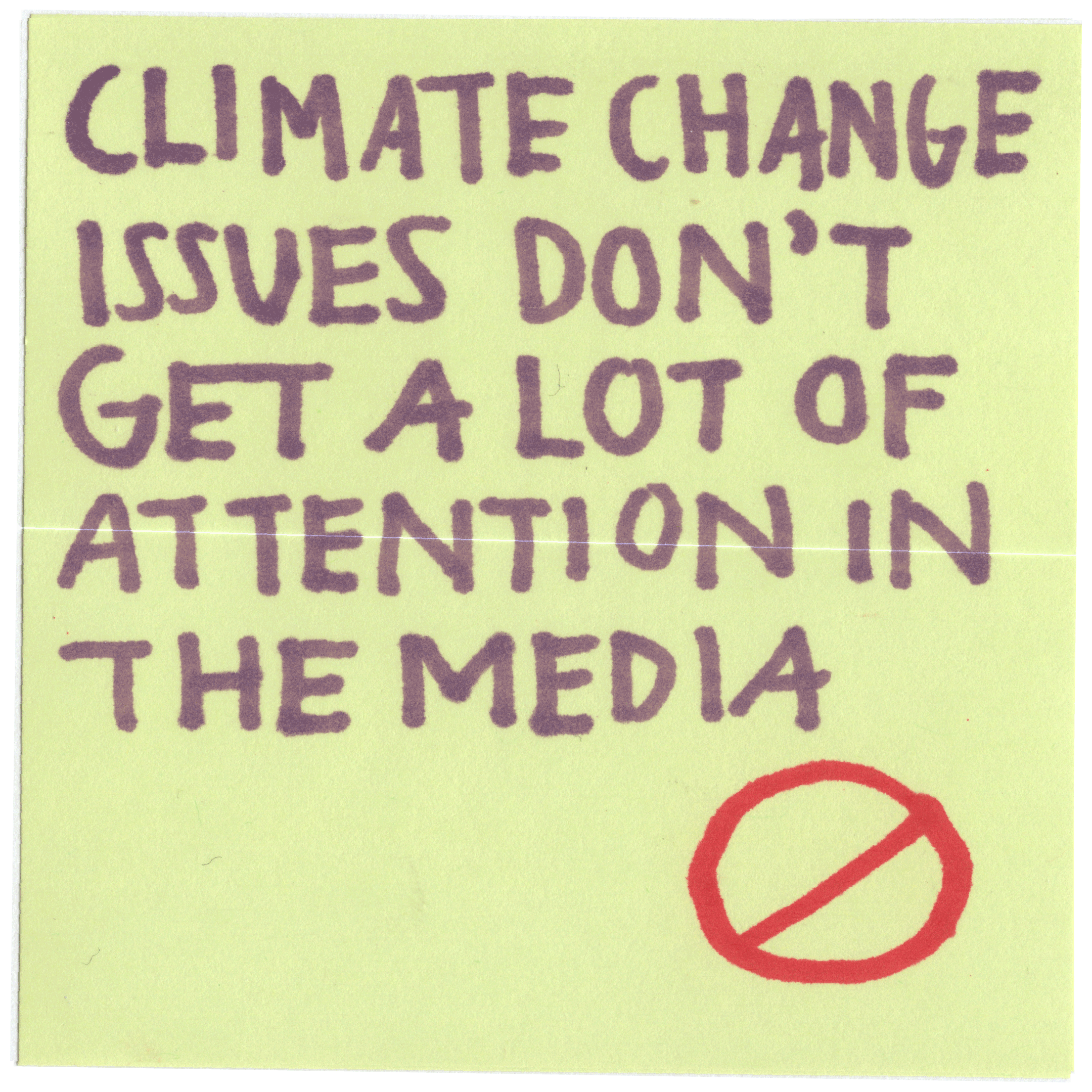 The Problem Tree brainstorm process begins with asking the question "How does this problem appear in every day life?" The group writes their answers on sticky notes, which represent the leaves of the tree. Below are a few sticky notes I illustrated. The responses I illustrated are from an existing Problem Tree diagram about Climate Change.